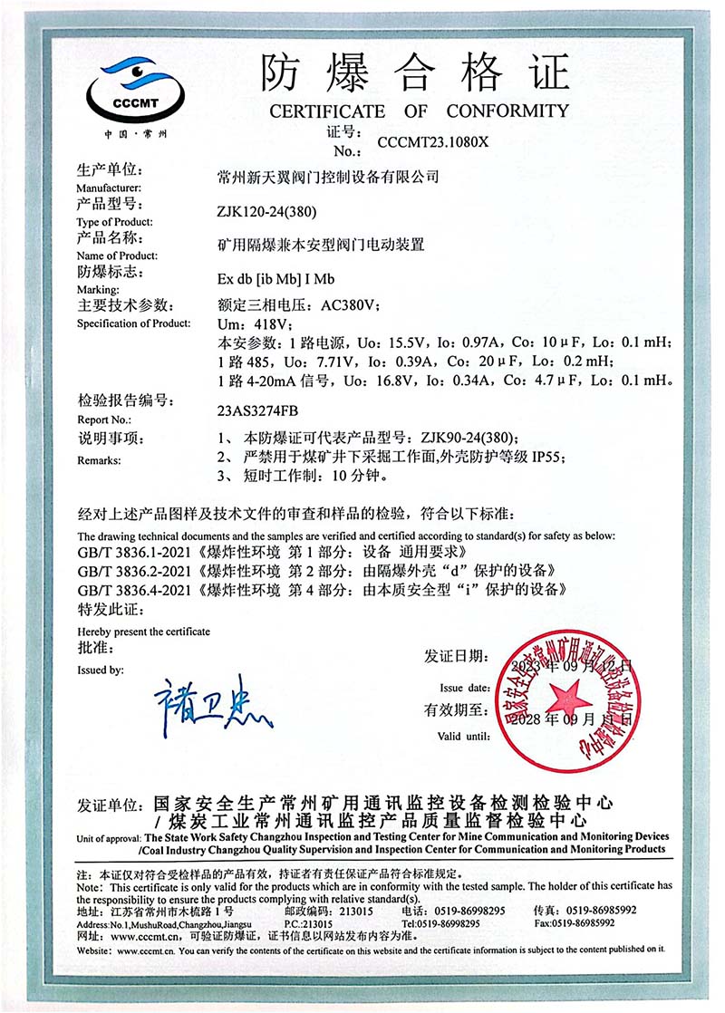 礦用產品安全標志證書ZJK120-24(380)